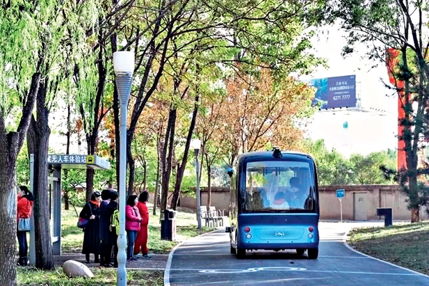 Visitantes prueban un bus eléctrico sin chofer en un parque de inteligencia artificial en Beijing.