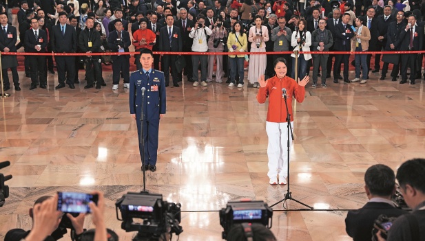 Periodistas chinos y extranjeros trabajan de forma ordenada en la zona de entrevistas, difundiendo al mundo las Dos Sesiones y mostrando la apertura y confianza de China. Zhang Wei
