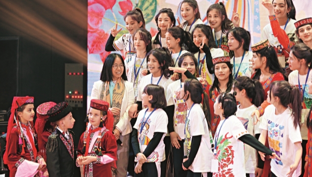 2 de abril de 2024. Wang Fang (quinta desde la izq.) conversa con las jóvenes del coro tras un concierto benéfico celebrado en la ciudad de Kashgar, región autónoma uigur de Xinjiang. Fotos de Xinhua |