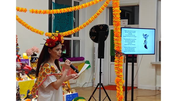Gelmy recita un poema en el acto de inauguración. Foto de la Embajada de México Las visitas guiadas al Altar de Muertos en la Embajada de México en China se mantendrán desde el 3 hasta el 14 de noviembre. |