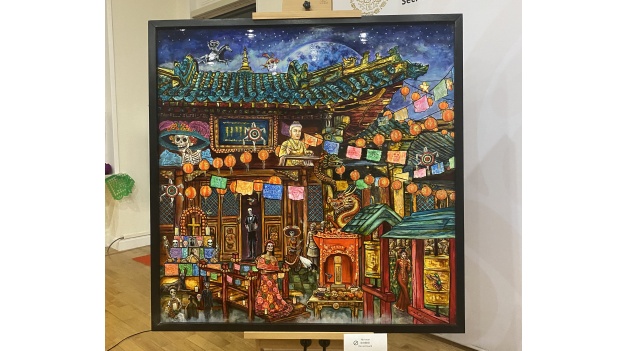 Karla con la otra obra. Cai Jiayi Gelmy: Un momento especial para los mexicanos en China Durante la inauguración, Gelmy, una estudiante mexicana que se encuentra cursando sus estudios en la Universidad Normal de Beijing, recitó un emotivo poema. Además, destacó la labor que realiza la Embajada de México en China, la cual cada año organiza diversas actividades con el fin de difundir la cultura y tradiciones mexicanas, siendo eventos como el Día de Muertos especialmente significativos para los mexicanos residentes en China, al hacerlos sentir cerca de casa y mantener vivas sus tradiciones. En razón de ello, alabó al personal de la Embajada, al acercar a los estudiantes mexicanos a la cultura pese a la distancia.