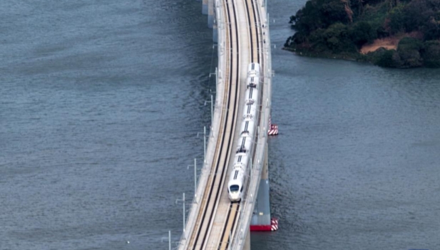 Un tren bala circula por un puente a lo largo del ferrocarril de alta velocidad Guangzhou-Zhanjiang, en la provincia de Guangdong, en el sur de China, el 22 de diciembre de 2025. Con una longitud aproximada de 401 kilómetros, el tren de alta velocidad Guangzhou-Zhanjiang comenzó a funcionar el lunes. Con una velocidad máxima diseñada de 350 kilómetros por hora, el tiempo de viaje se puede reducir a aproximadamente una hora y media entre la estación de tren de Baiyun de Guangzhou y la estación de tren de Zhanjiang de Norte, ambas en Guangdong. (Xinhua/Wei Jie)