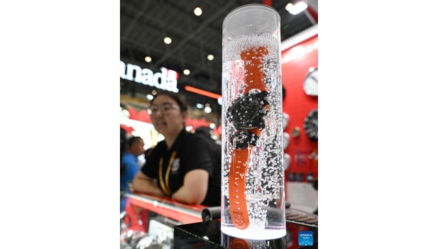 Imagen del 16 de abril de 2026 de un reloj expuesto en el pabellón de Suiza durante la sexta Exposición Internacional de Productos de Consumo de China (CICPE, por sus siglas en inglés), en Haikou, en la provincia de Hainan, en el sur de China. La sexta CICPE ha ampliado su escala, con una superficie de exposición de 143.000 metros cuadrados, 13.000 más que en la edición anterior. Las exposiciones internacionales representan el 65 por ciento del total, lo que constituye un aumento de 20 puntos porcentuales con respecto al año pasado. (Xinhua/Pu Xiaoxu)
