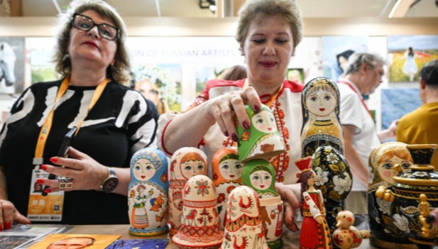 Expositoras muestran artesanías de Rusia durante la sexta Exposición Internacional de Productos de Consumo de China (CICPE, por sus siglas en inglés), en Haikou, en la provincia de Hainan, en el sur de China, el 16 de abril de 2026. La sexta CICPE ha ampliado su escala, con una superficie de exposición de 143.000 metros cuadrados, 13.000 más que en la edición anterior. Las exposiciones internacionales representan el 65 por ciento del total, lo que constituye un aumento de 20 puntos porcentuales con respecto al año pasado. (Xinhua/Pu Xiaoxu)