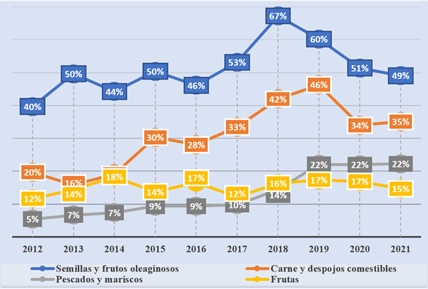 Si se observa el Gráfico 4, América Latina y el Caribe (ALC) exporta a China cada vez más productos alimenticios gracias al aumento de la clase media, la cual ha mejorado su calidad de vida y demanda variedad de productos frescos y preparados. Por ejemplo, en 2012, de todo lo importado por China desde el mundo en pescados y mariscos, el 5 % fue proveído por la región latinoamericana y caribeña, mientras que en 2021 esta participación fue del 22 %. En el caso de carnes y despojos comestibles, China importó de ALC el 20 % del total desde el mundo en 2012, mientras que en 2021 esta participación fue del 35 %. Por otro lado, Perú y Chile se encuentran entre los 10 principales proveedores para China de algunas frutas como los arándanos, las cerezas, las uvas red globe, etc., y en el caso del ítem semillas y frutos oleaginosos, Brasil y Argentina son los principales proveedores para China en soja, que se utiliza principalmente como alimento en la industria ganadera.