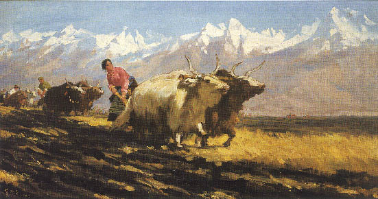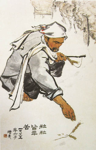 Sin embargo, algunos comenzaron a transformar este patrimonio artístico para satisfacer las necesidades del nuevo período y pronto se produjo un avance con uno de los tres géneros tradicionales, la pintura de figuras, aplicada para representar la felicidad de la labor, que fue introducida por Yang Zhiguang (1930- ), cuyas obras incluían Primera vez en mi vida y Envío de comida en un día de nieve. Una pieza icónica de Fang Zengxian (1931- ), titulada Cada grano es el fruto del trabajo duro, mostraba a un agricultor viejo recogiendo una espiga de trigo que se había caído de un carro, con una pincelada sencilla, vívida y natural.