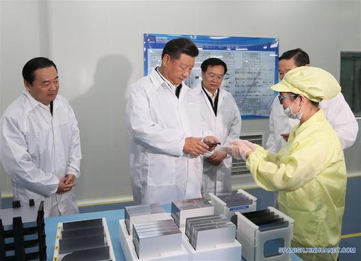 En una visita a una compañía de energía solar en Xining, Xi vio la línea de producción de paneles solares y preguntó sobre diversos aspectos del proceso de producción.