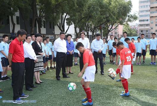 El presidente también habló con un grupo de estudiantes que jugaban fútbol y posó con ellos para unas fotos. Como ávido simpatizante del fútbol en la educación, Xi alentó a los estudiantes a que aspiren a ser futbolistas excelentes.