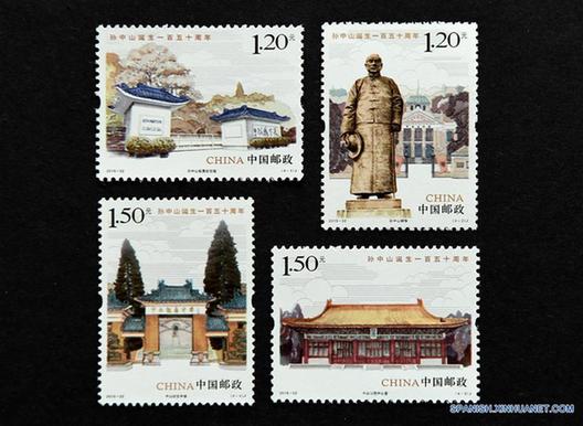 Estampillas conmemorativas del 150 aniversario del nacimiento de Sun Yat-sen son mostradas en Beijing, capital de China, el 12 de noviembre de 2016. El Correo de China emitió un conjunto de estampillas conmemorativas por el 150 aniversario del nacimiento de Sun Yat-sen el sábado. (Xinhua/Li He)