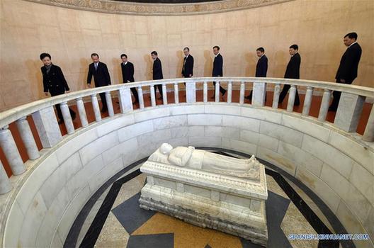 Hu y otros altos funcionarios depositaron flores ante la estatua de Sun.